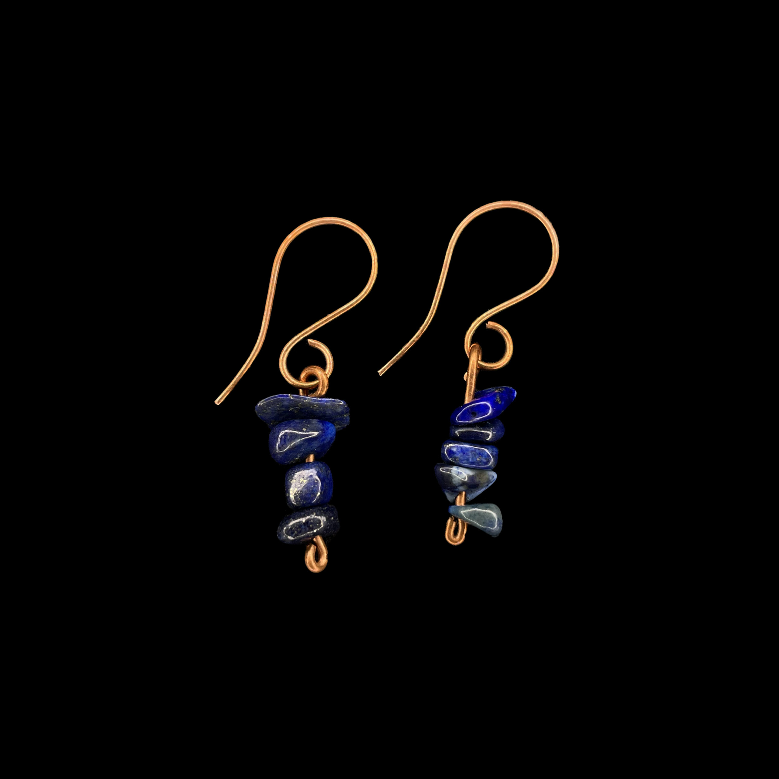 Let Crowling’s Feather wrap you in an aura of quiet magic. These earrings feature raw lapis lazuli chips in deep, shifting shades of blue — from ink to sapphire — stacked like tiny feathers in flight. The stones hang delicately on hand-shaped copper wire, allowing the texture and color to speak for themselves. A tribute to mystery, intuition, and the wild spirit, these earrings are perfect for days when you want your jewelry to tell a story without saying a word.